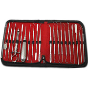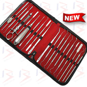 20 dental equipment that are Dental Scaler, Scraper, Dental Mirror and Dental Tartar/Plaque Remover, Forceps, Tweezers, Specula, Amalgam, material - stainless steel. Also comes with a Premium Black Leather Travel Pouch/Case.